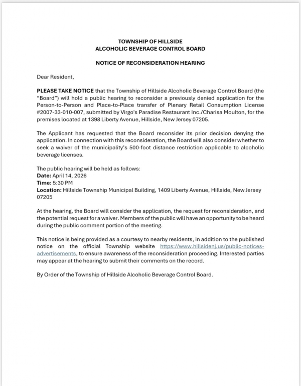 public hearing will be held as follows: Date: April 14, 2026 Time: 5:30 PM Location: Hillside Township Municipal Building, 1409